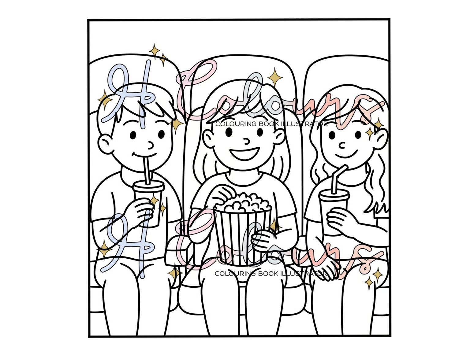 A fun colouring page showing children sitting in a cinema, watching a movie and enjoying big buckets of popcorn and drinks.