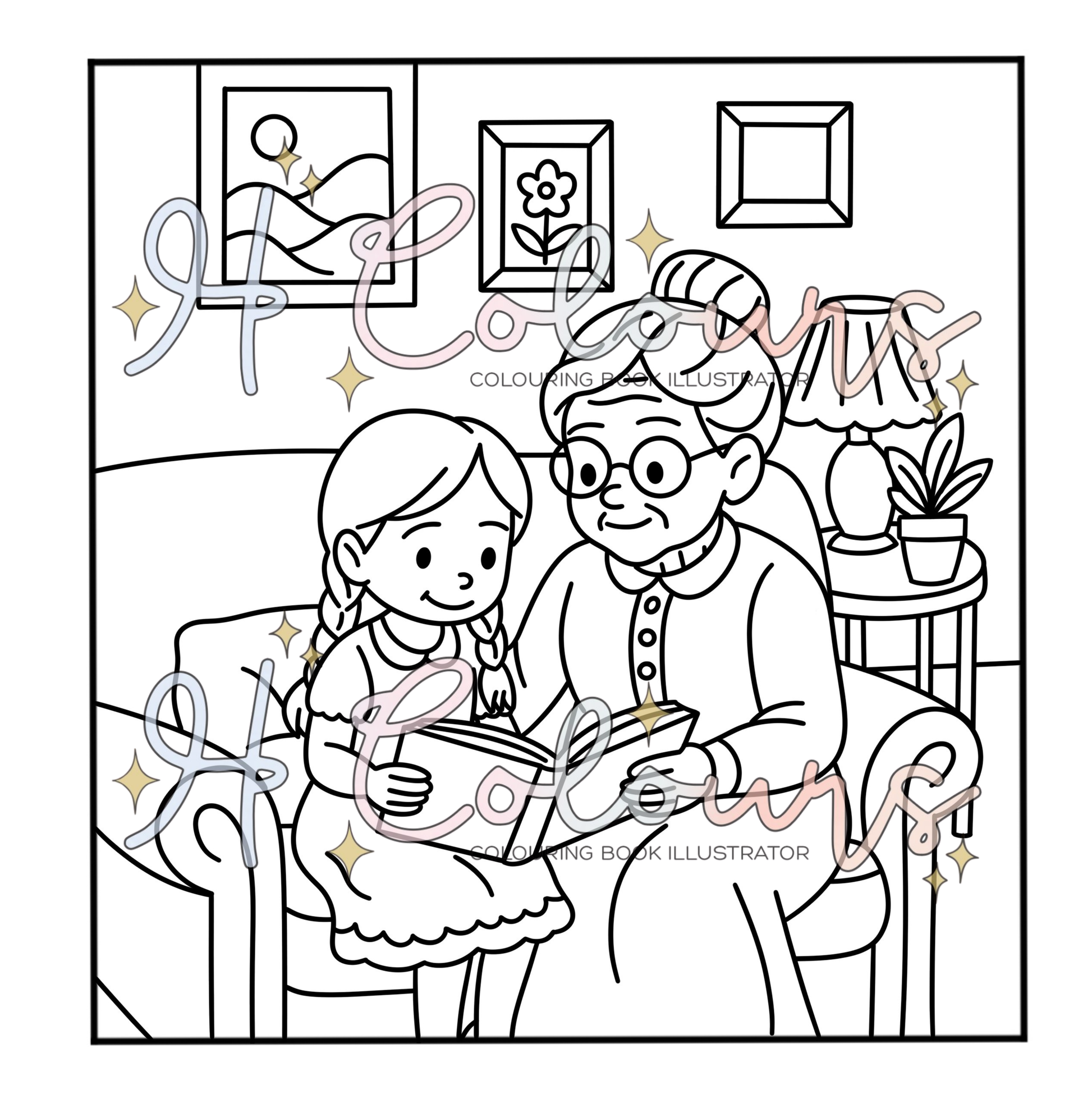 A charming digital colouring page featuring a child and grandma enjoying a quiet reading moment together. Perfect for rainy days, creative time, or bonding activities. Simply download, print, and colour. Ideal for children aged 4+. Instant digital download—no shipping required.