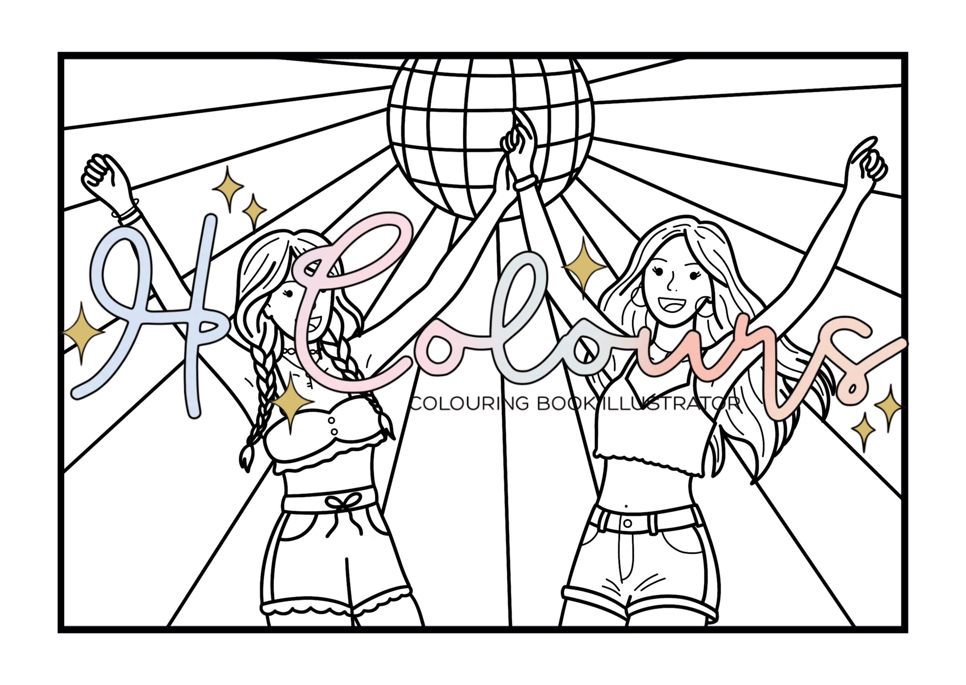 Bring the party to life with this high-energy disco-themed colouring postcard! Featuring two friends dancing under a shimmering disco ball, this illustration is packed with movement and retro vibes. It’s a celebration of friendship and fun, ready for you to add a burst of vibrant color.